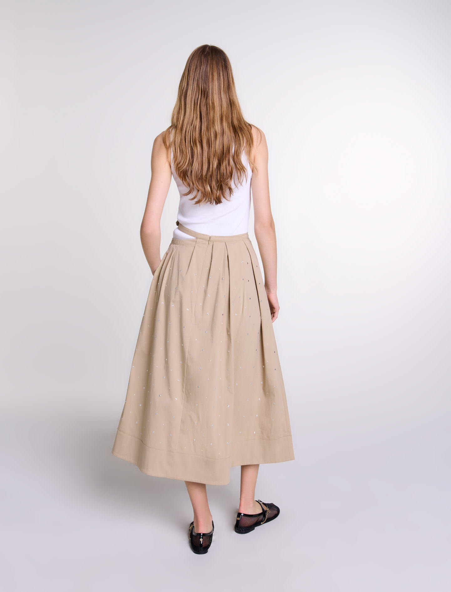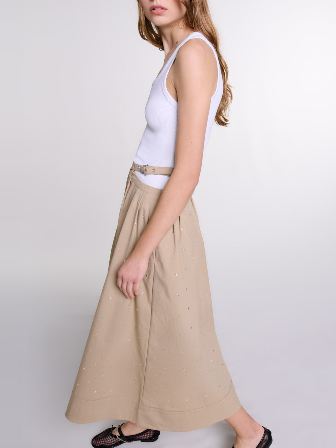 Long cotton gabardine skirt Mid-rise waist Flat silver studs Slender cutaway belt with buckle 2 pockets Full skirt Zip fastening at back.