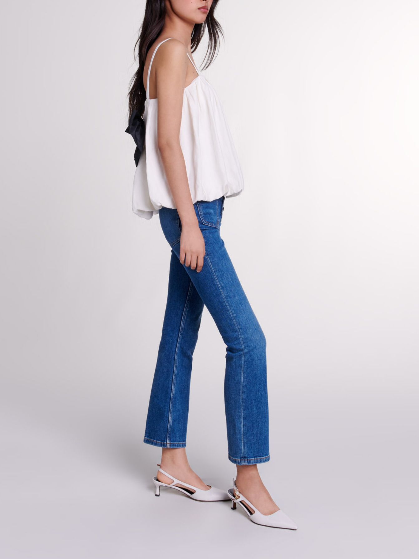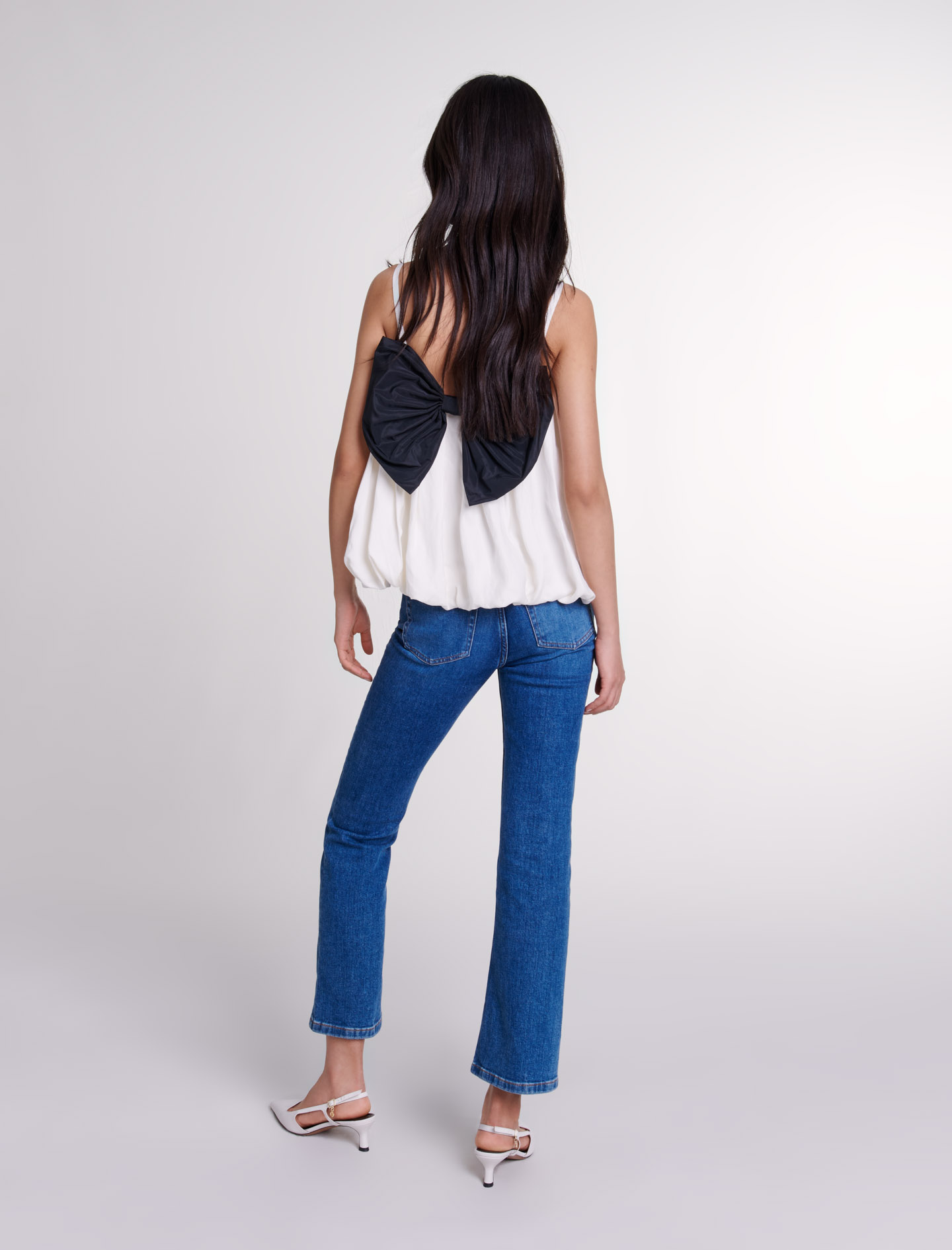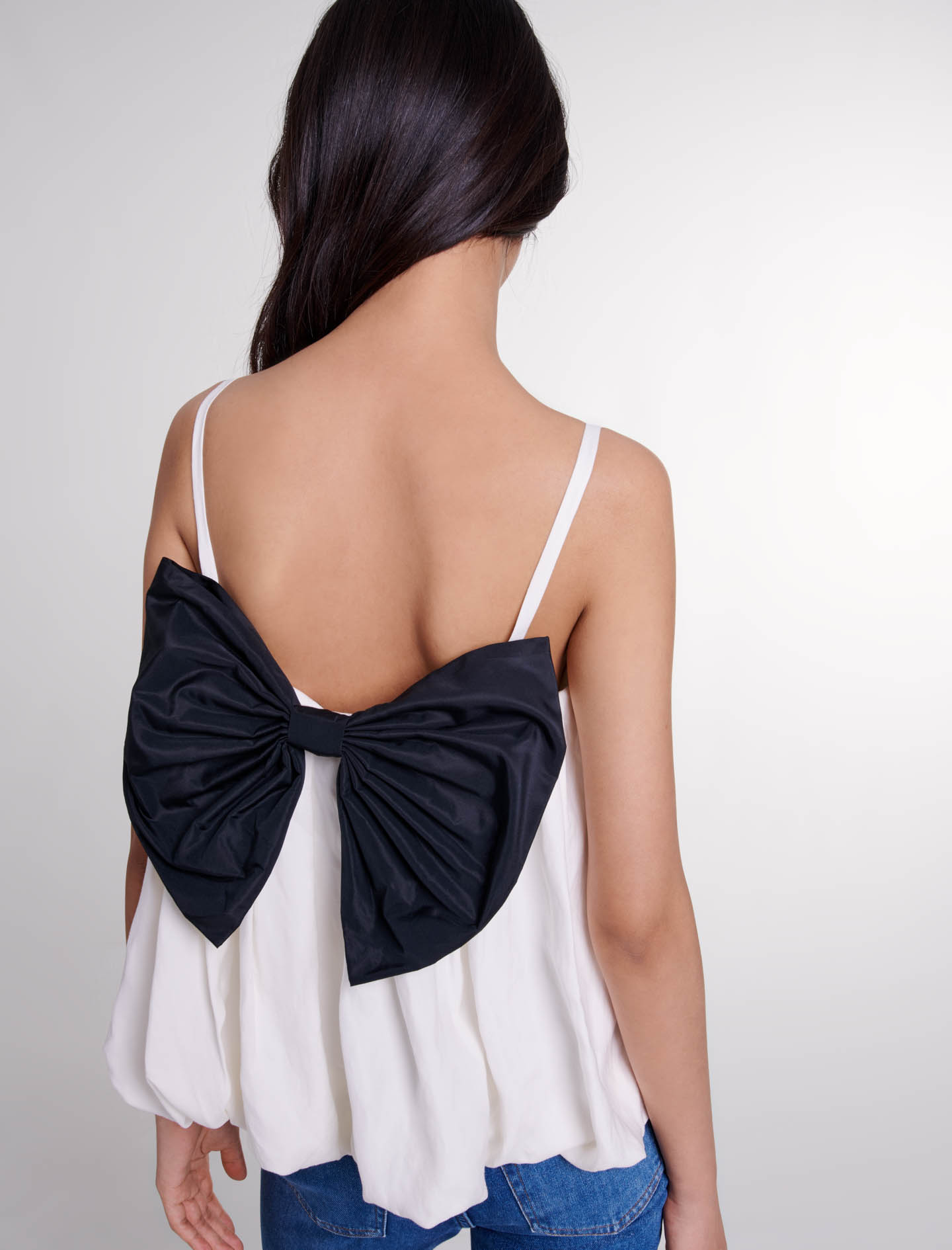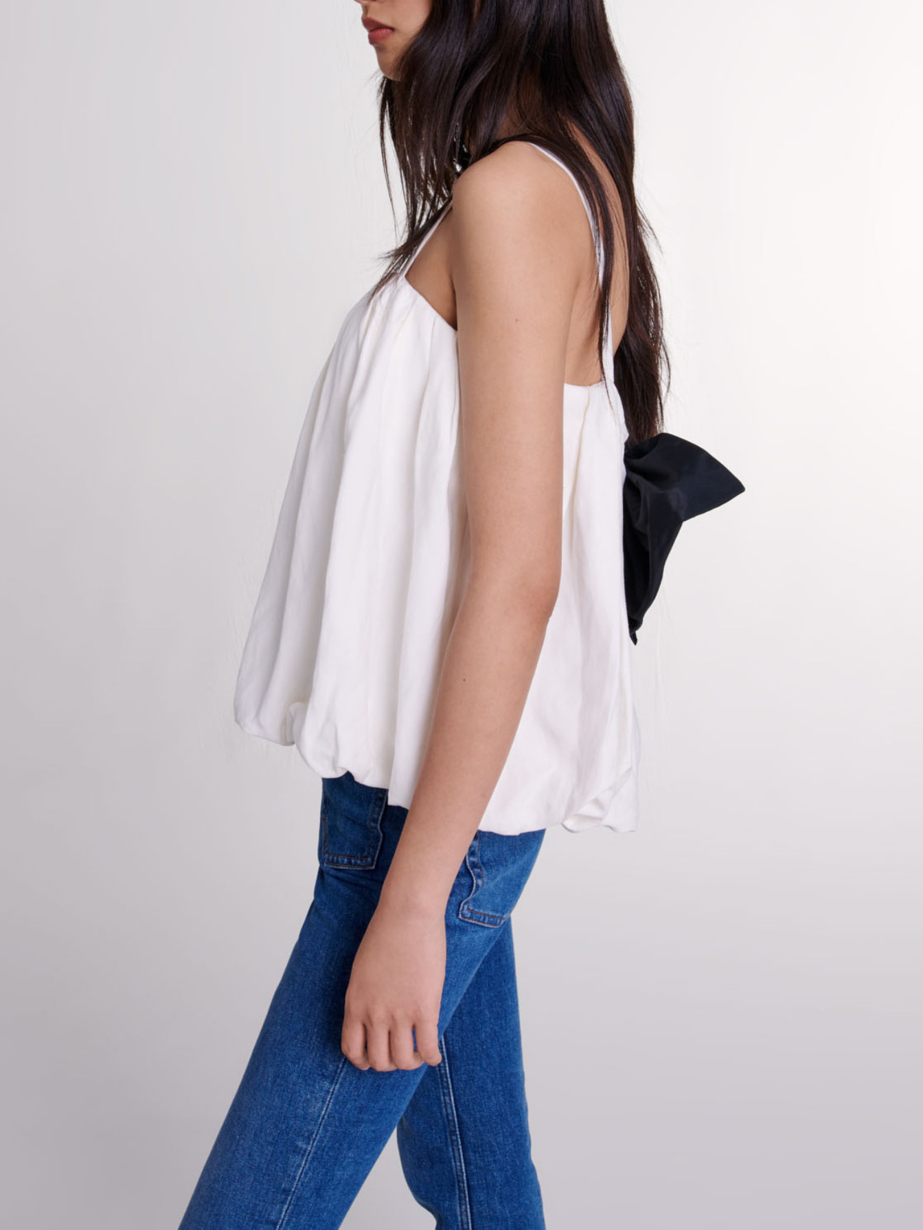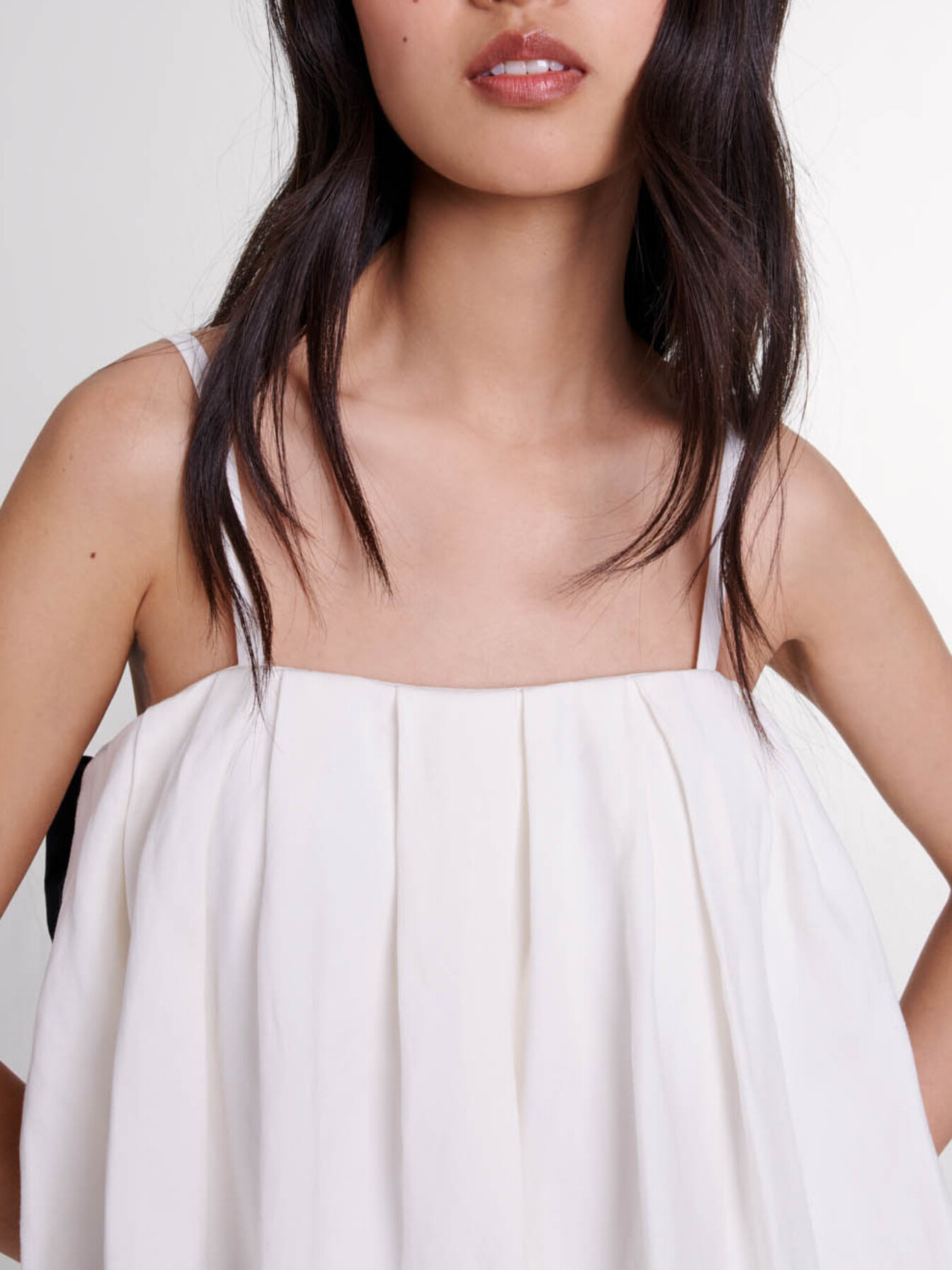 Baggy top Spaghetti straps with adjustable buttons Bra with built-in cups Straight neckline Pleats creating a ball effect at the bottom Brooch with an XL bow at the back Side zip fastening Lined.