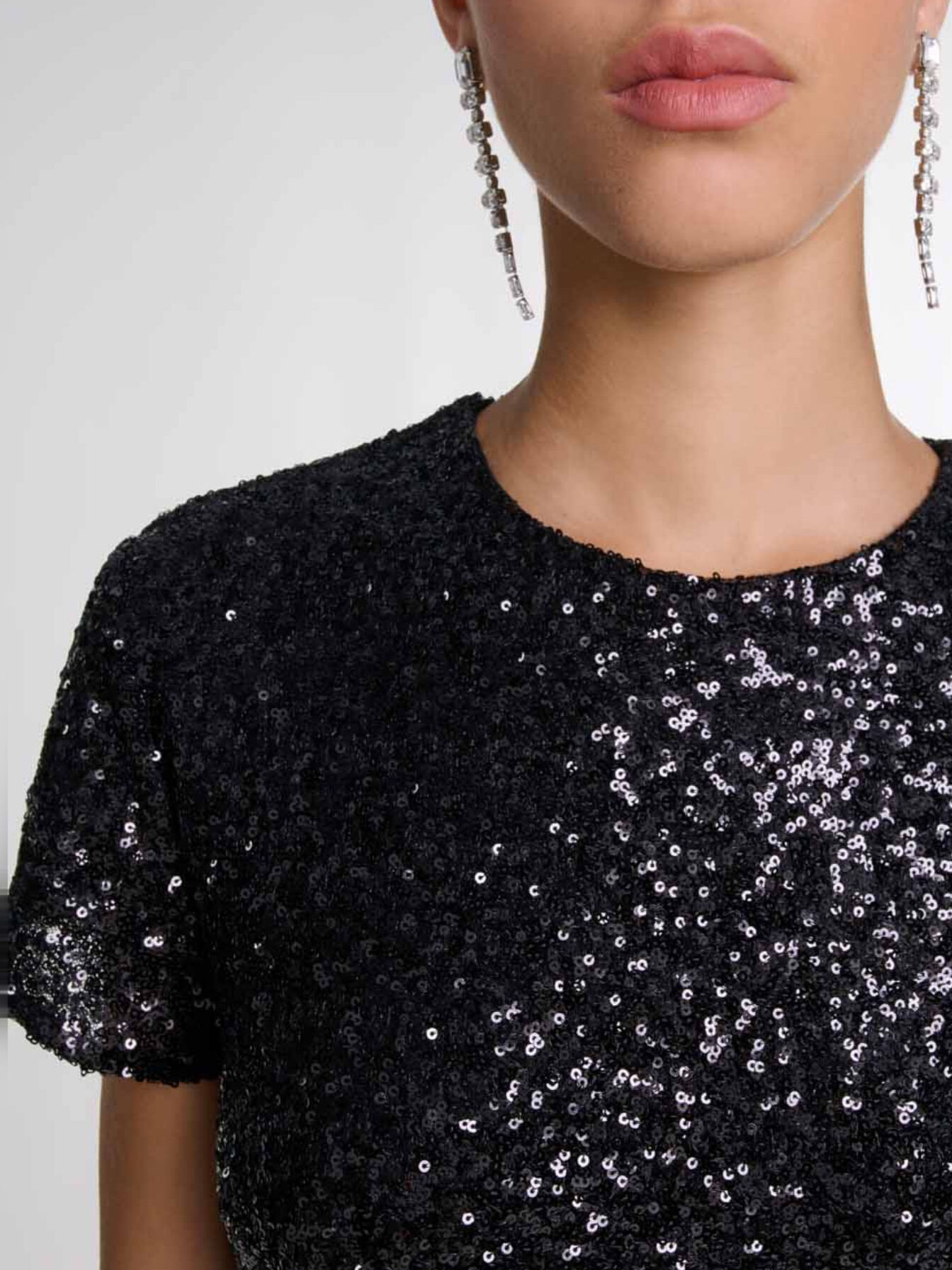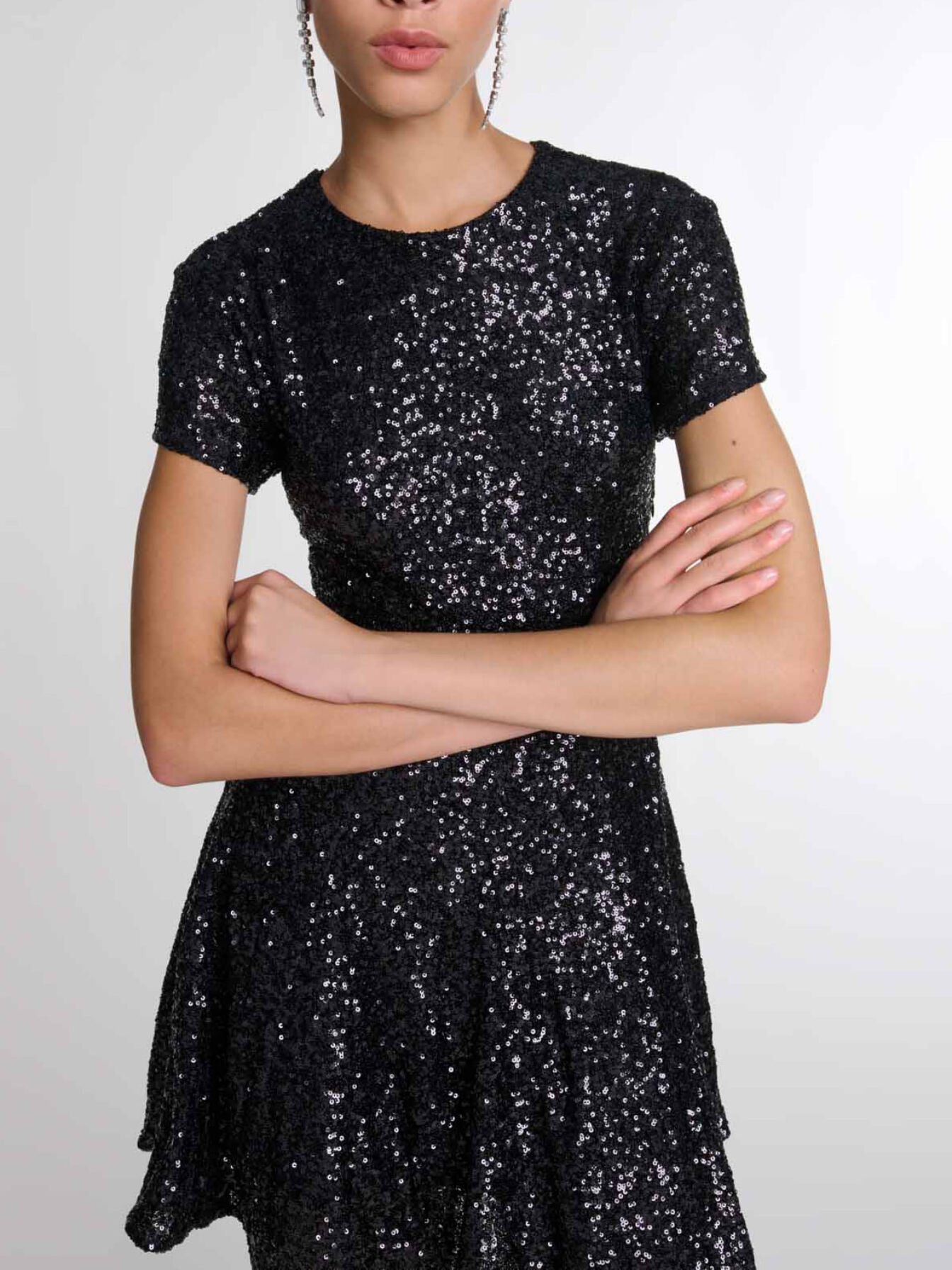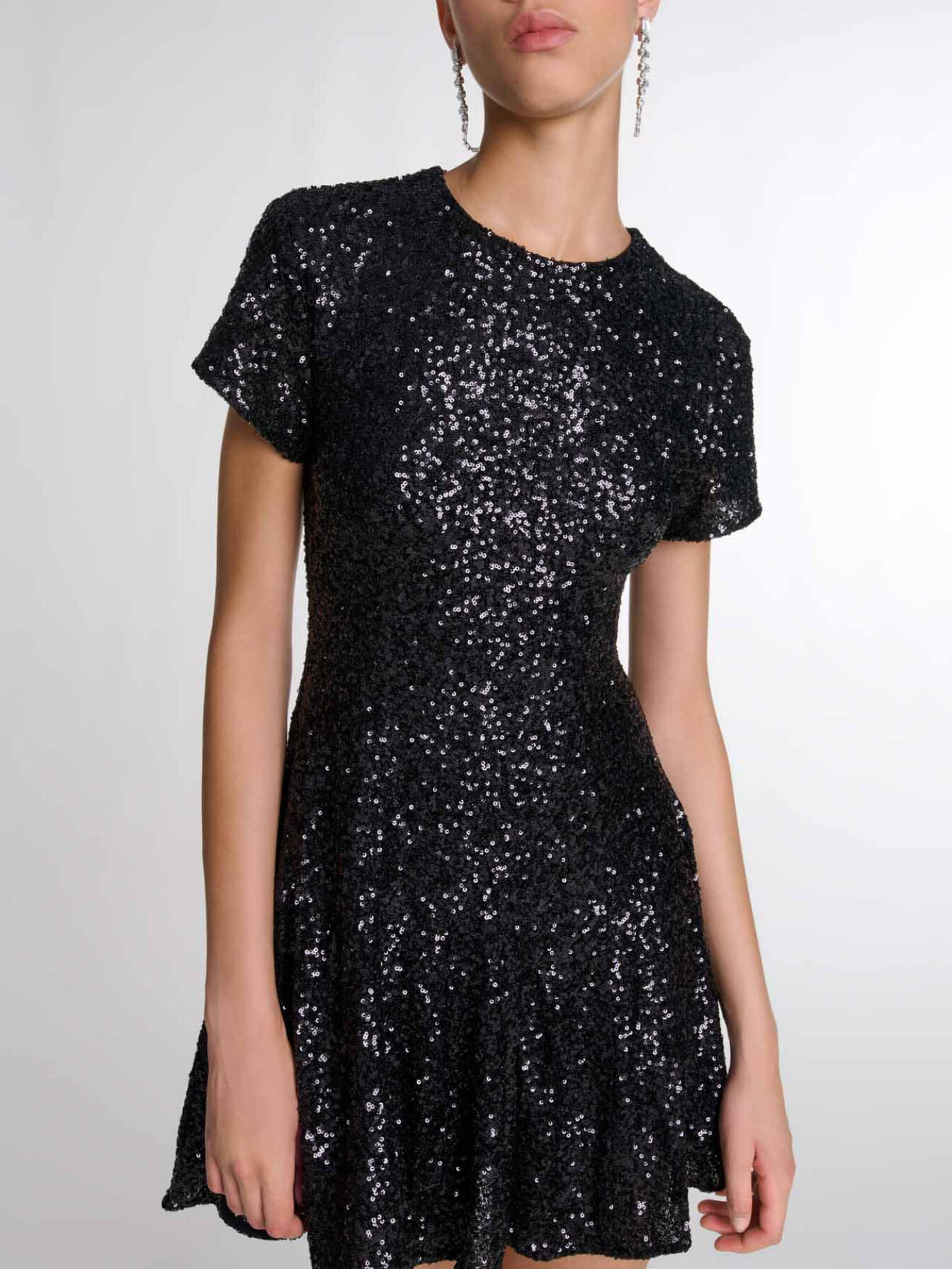 Short dress All-over sequins Round neck Short sleeves Buttoned teardrop opening at back Flared skirt Lined.