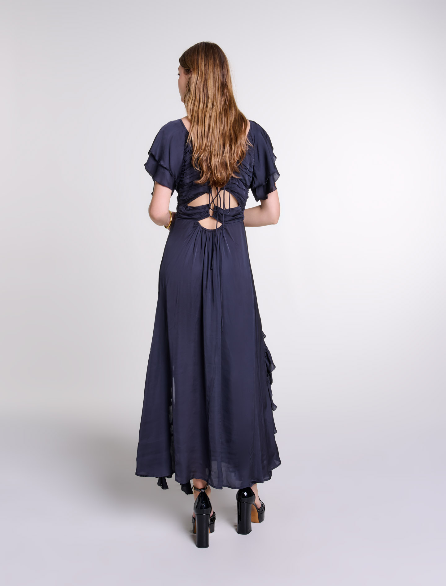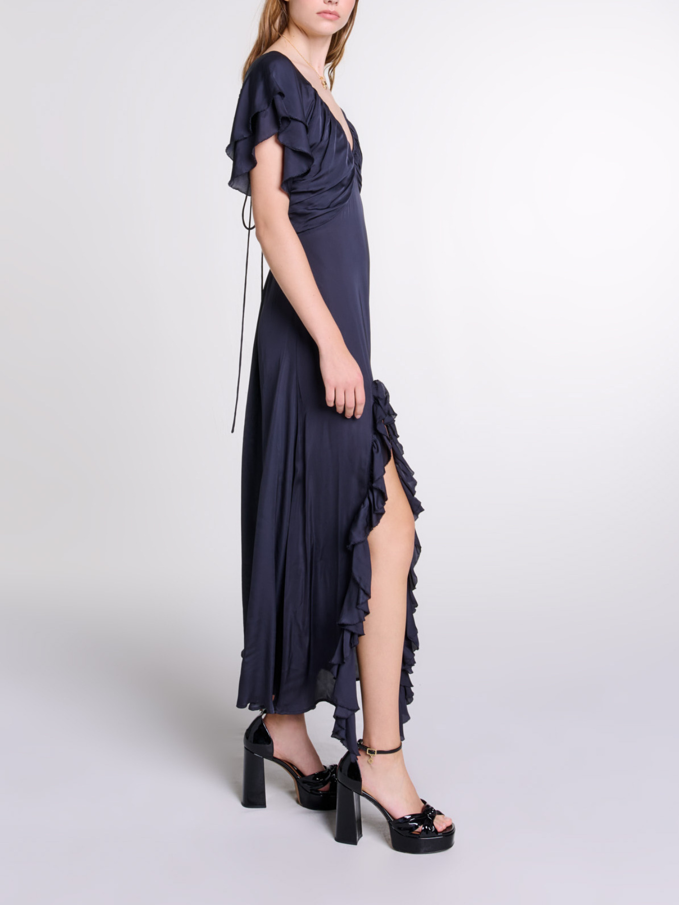 Ruffled satin maxi dress Ruched-effect V-neck Ruffles Short sleeves Split ruffled skirt Flared Cross-over lacing at back.