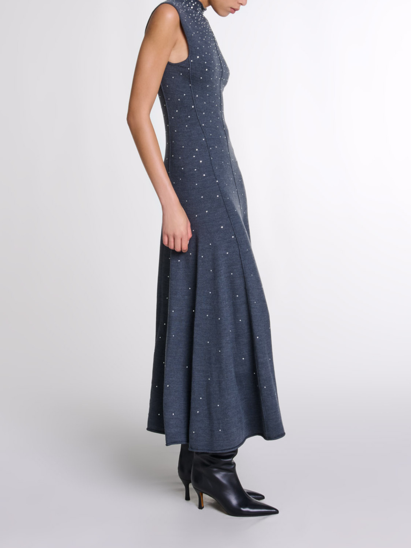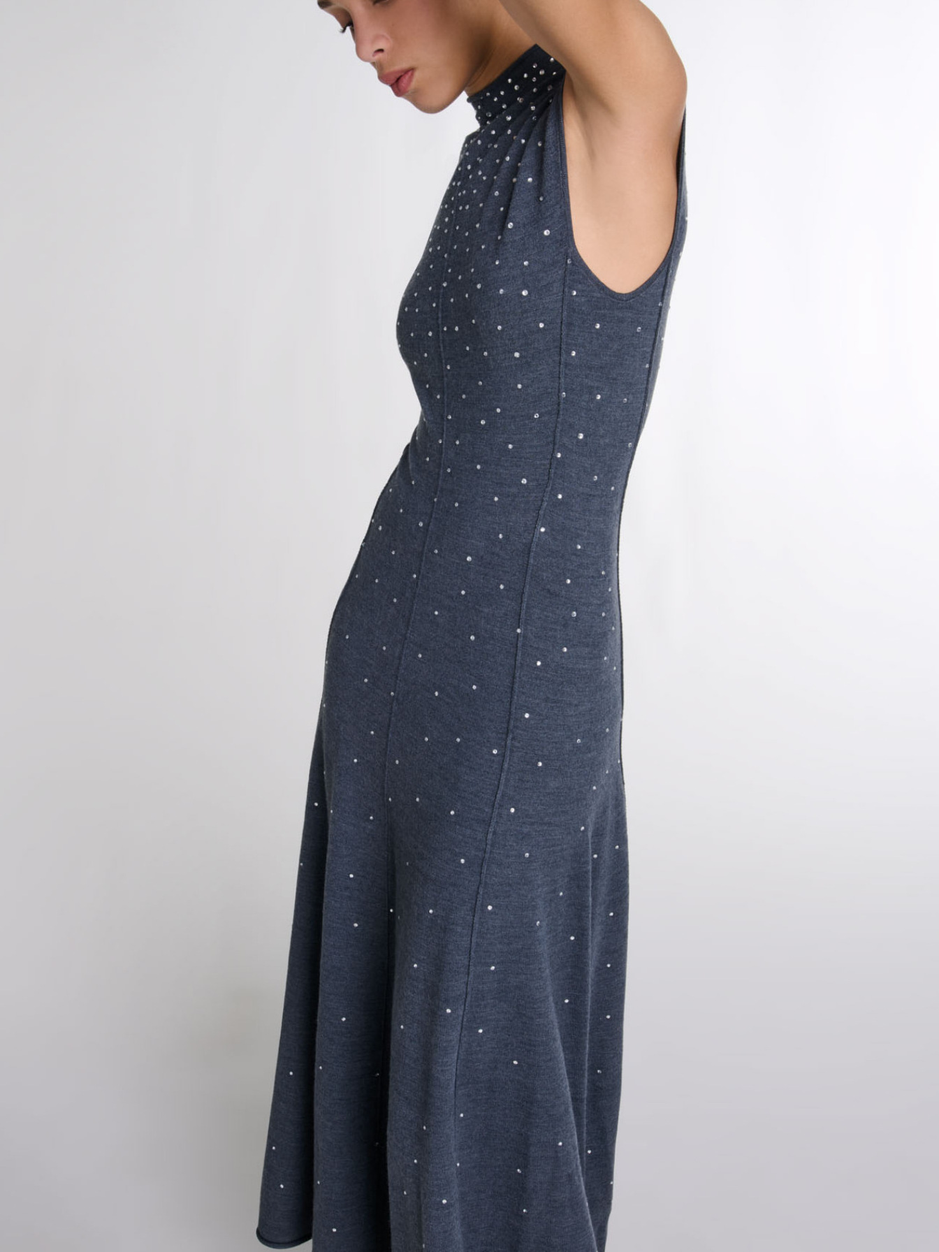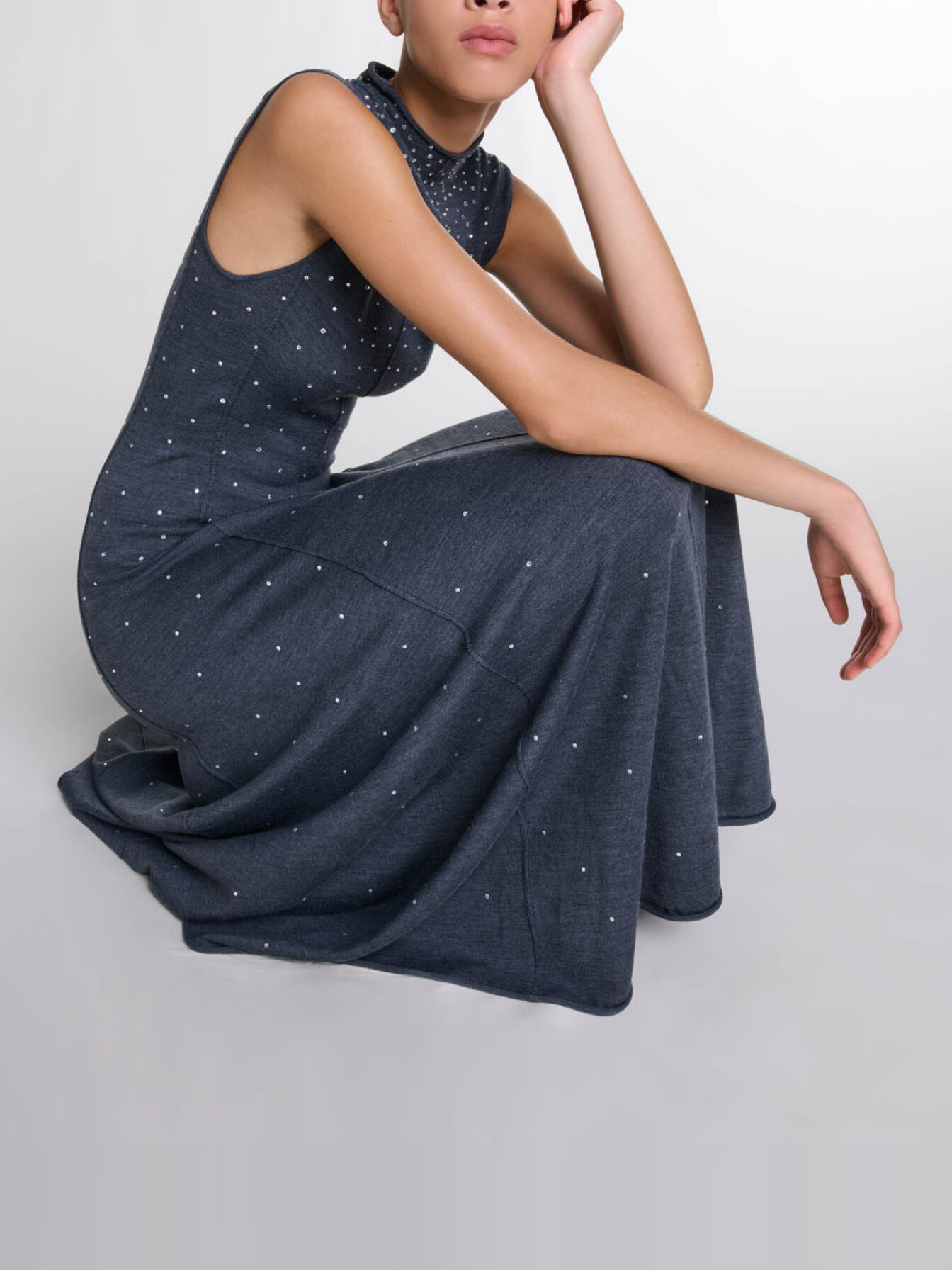 Knit maxi dress Rhinestones Sleeveless Turtleneck Pleats Flared skirt.