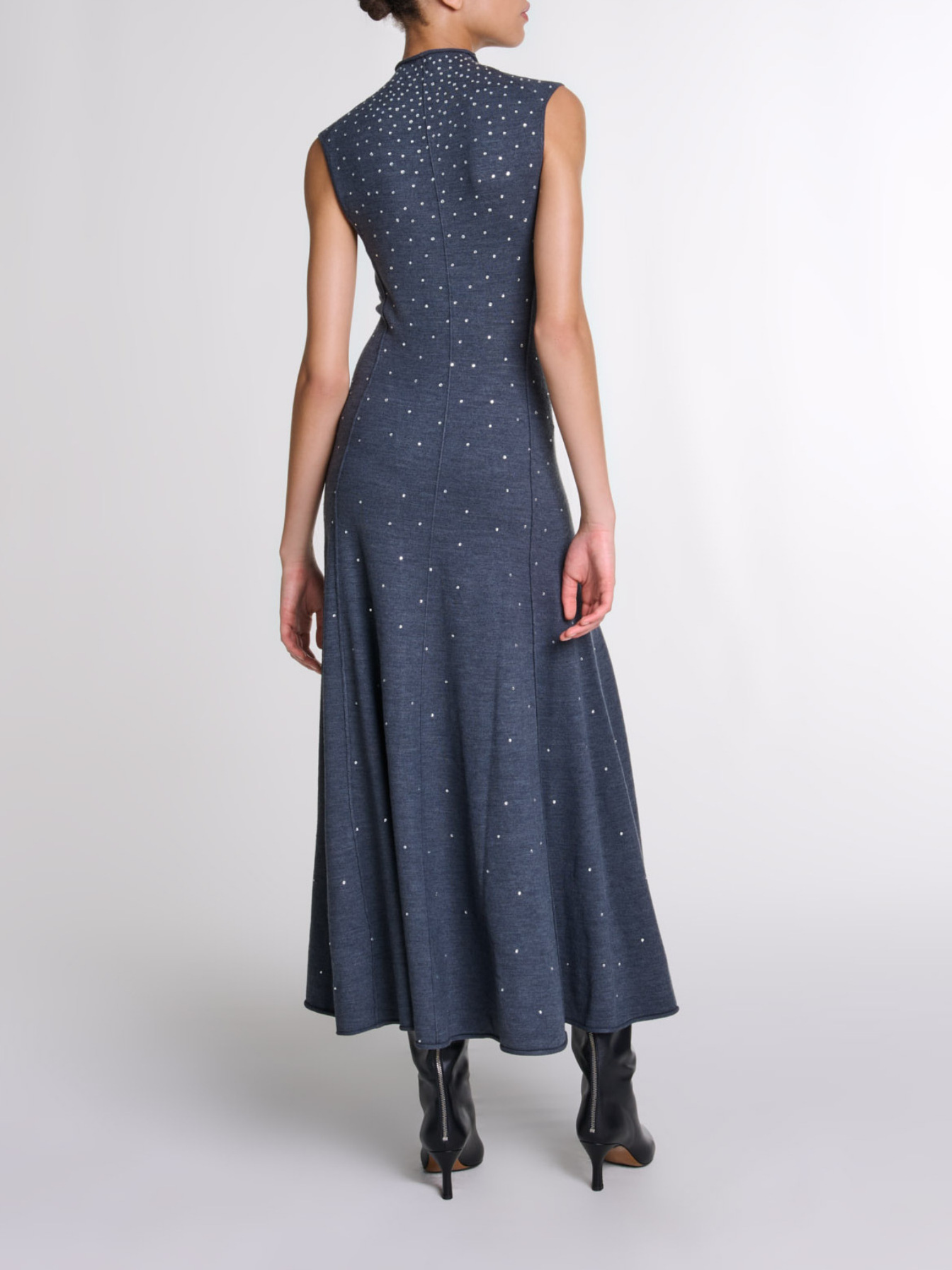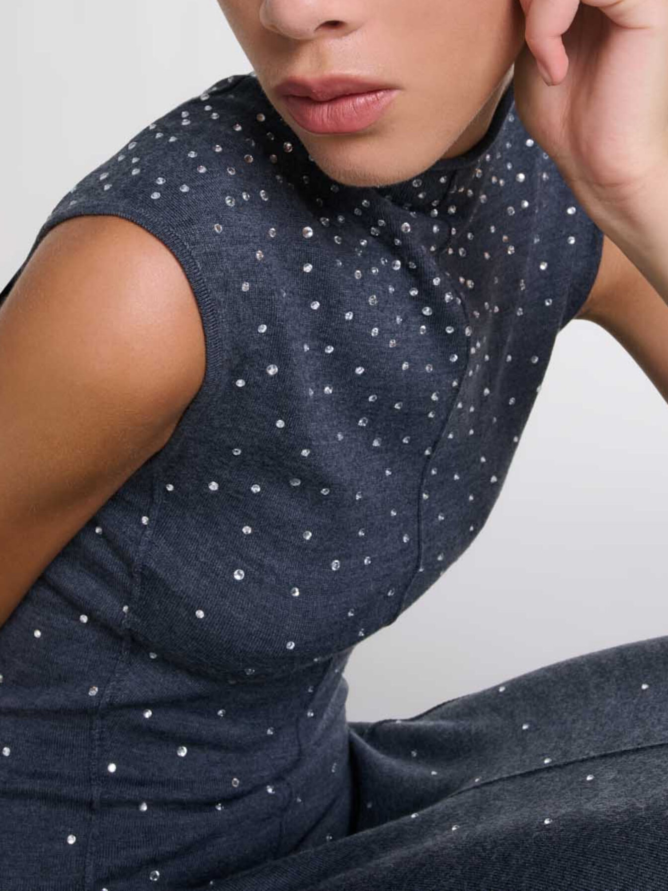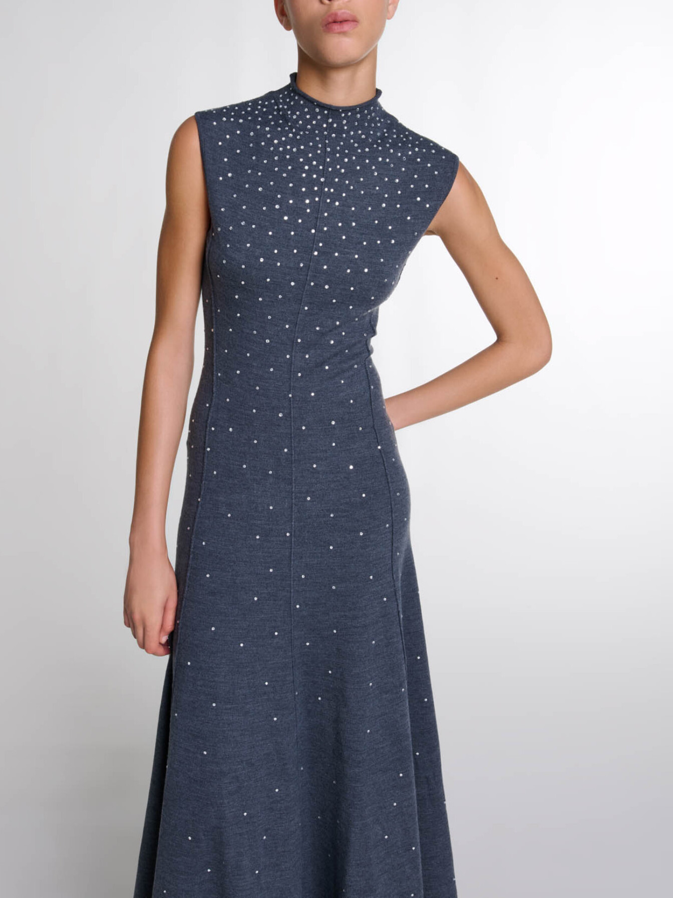 Knit maxi dress Rhinestones Sleeveless Turtleneck Pleats Flared skirt.