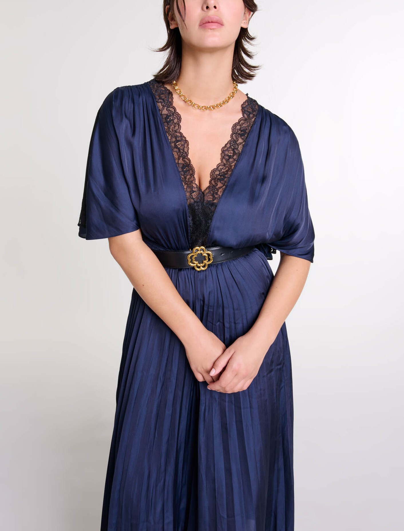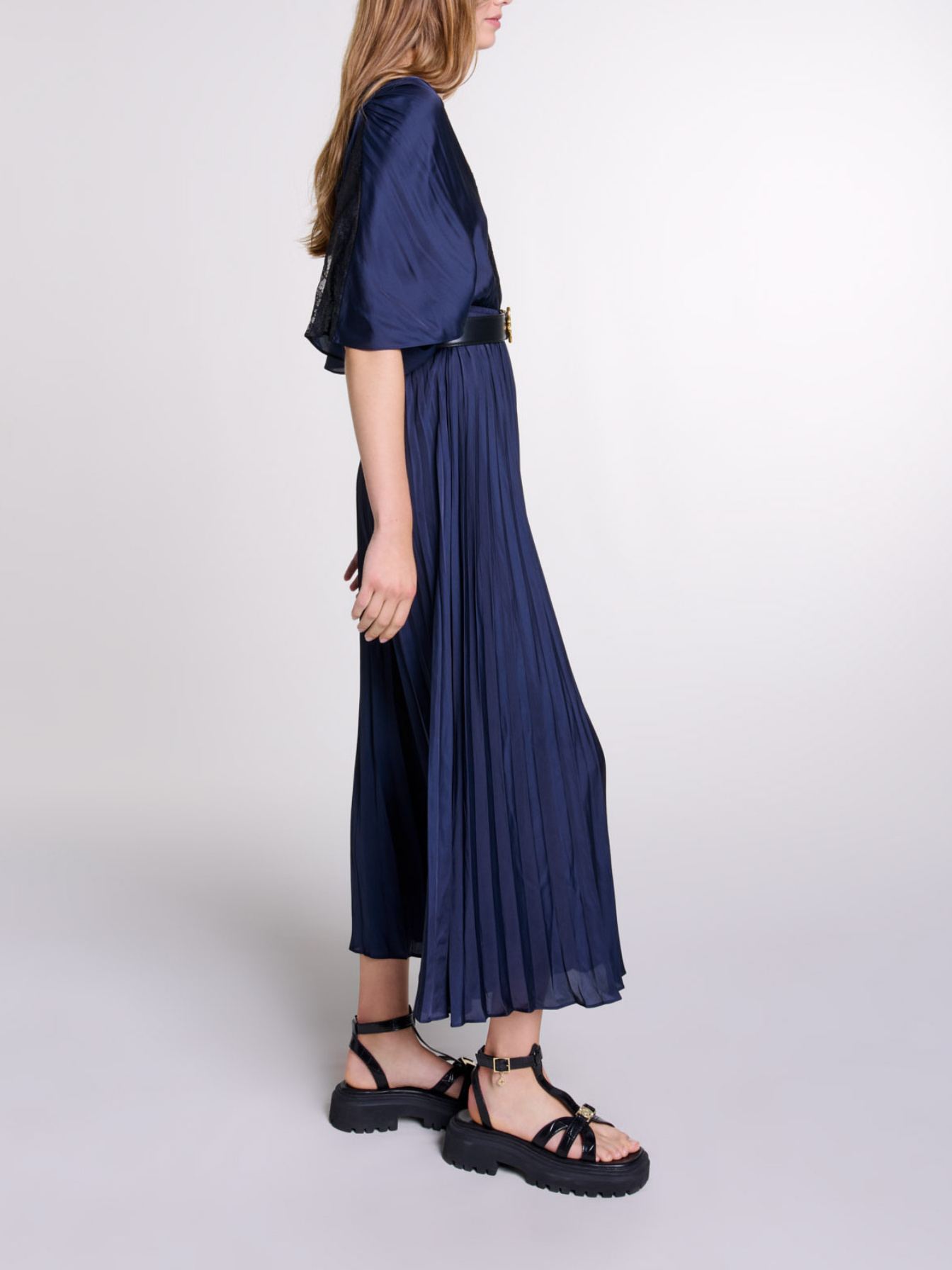 Maje Woman's polyester Pleated maxi dress with lace for Fall/Winter, in color Navy/Black /