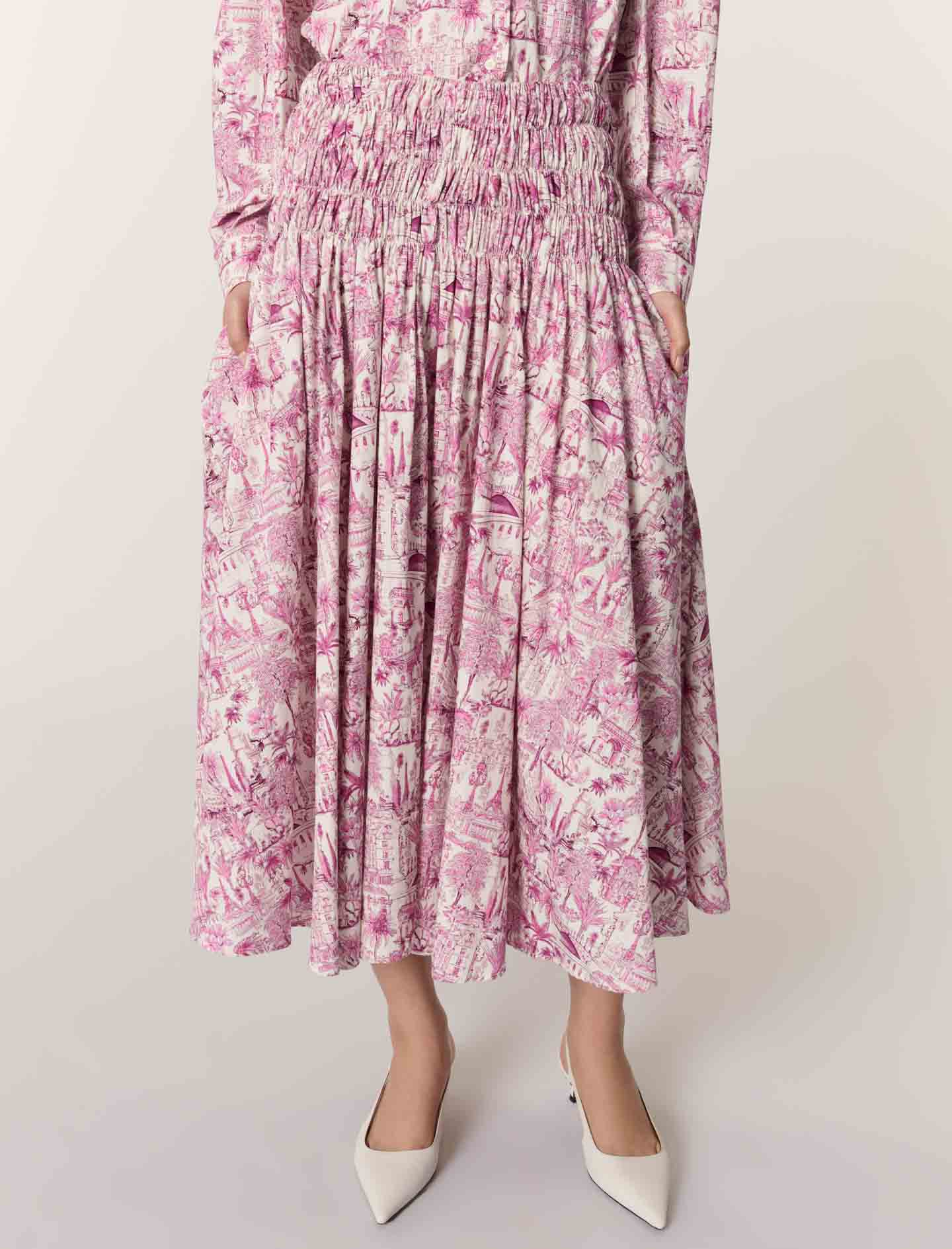 Printed maxi skirt Smocked, elasticated waist Full at the bottom.