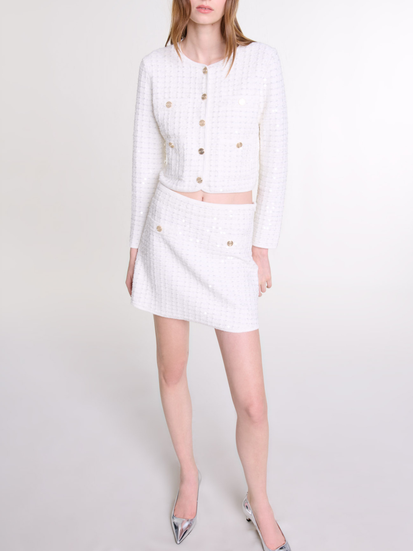 Short slightly flared warp knit skirt Transparent sequins 2 welt pockets with buttons Side zip fastening Elasticated waist.