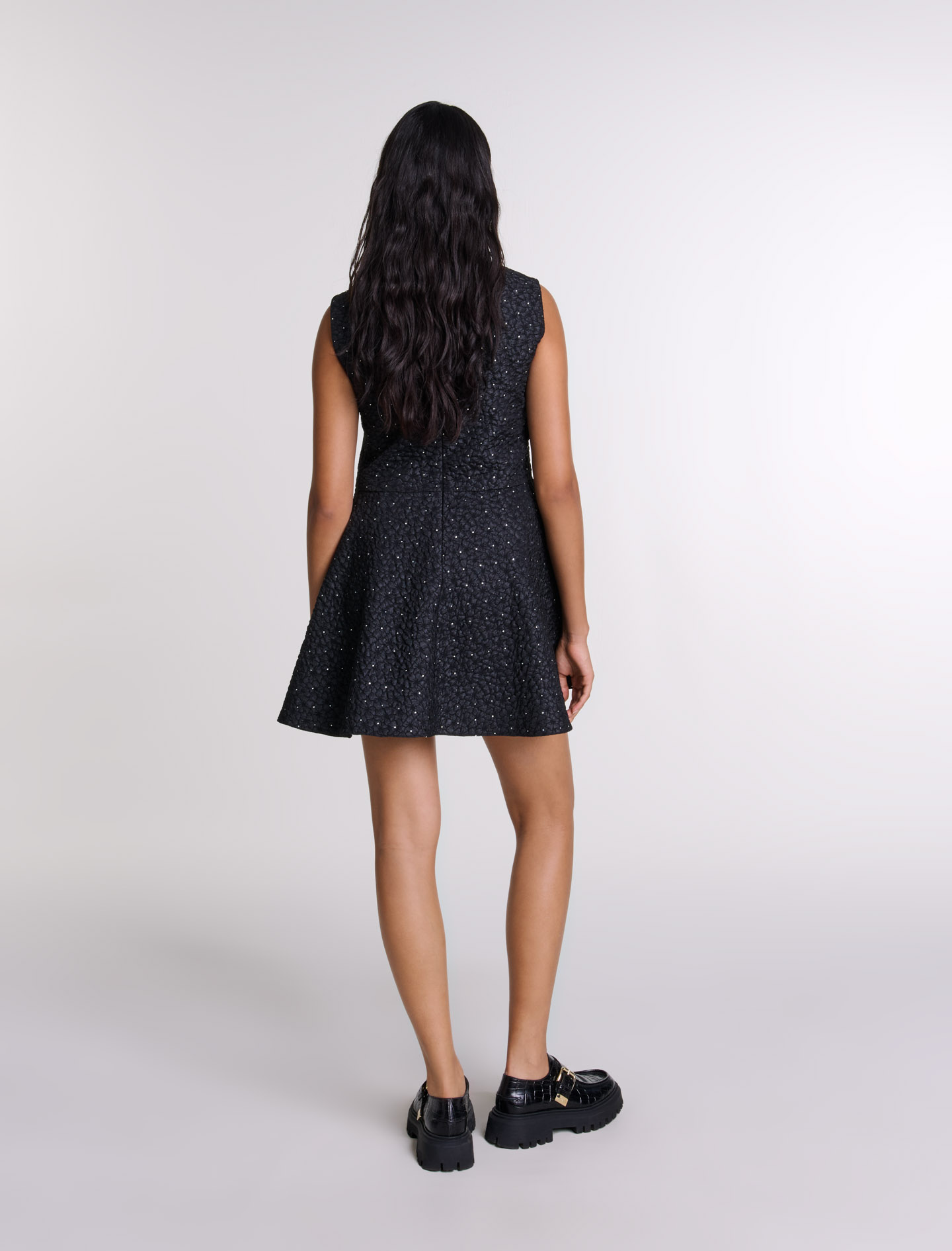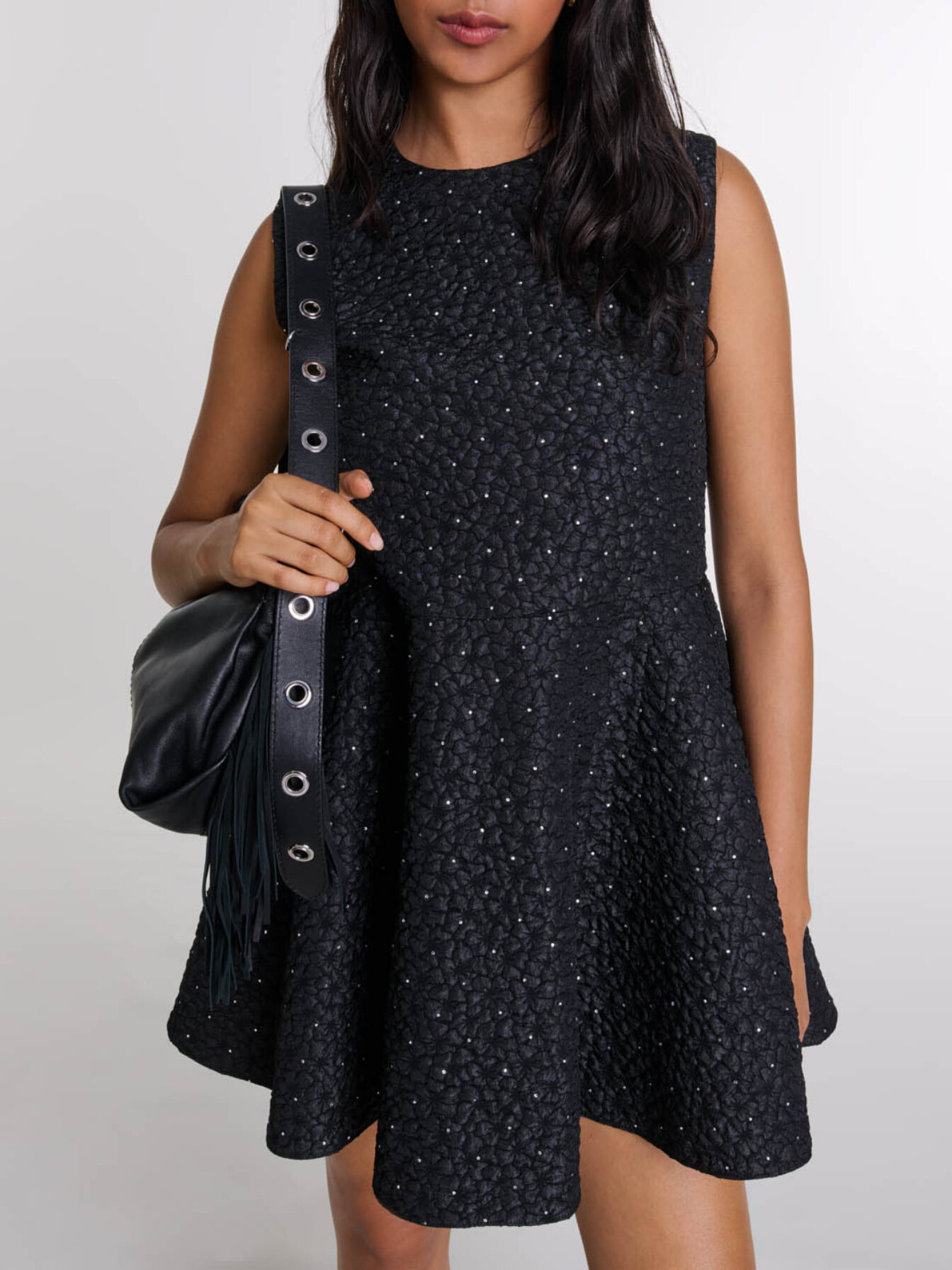 Layered playsuit dress Textured fabric with flowers and rhinestones Round neck Sleeveless Flared skirt Zip fastening at back Satin-effect shorts lining.