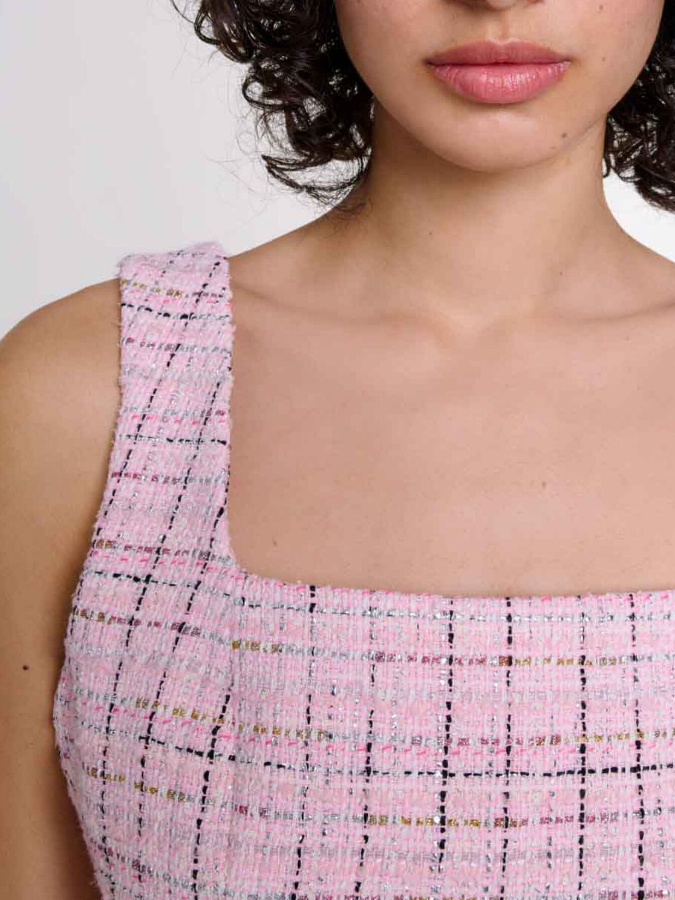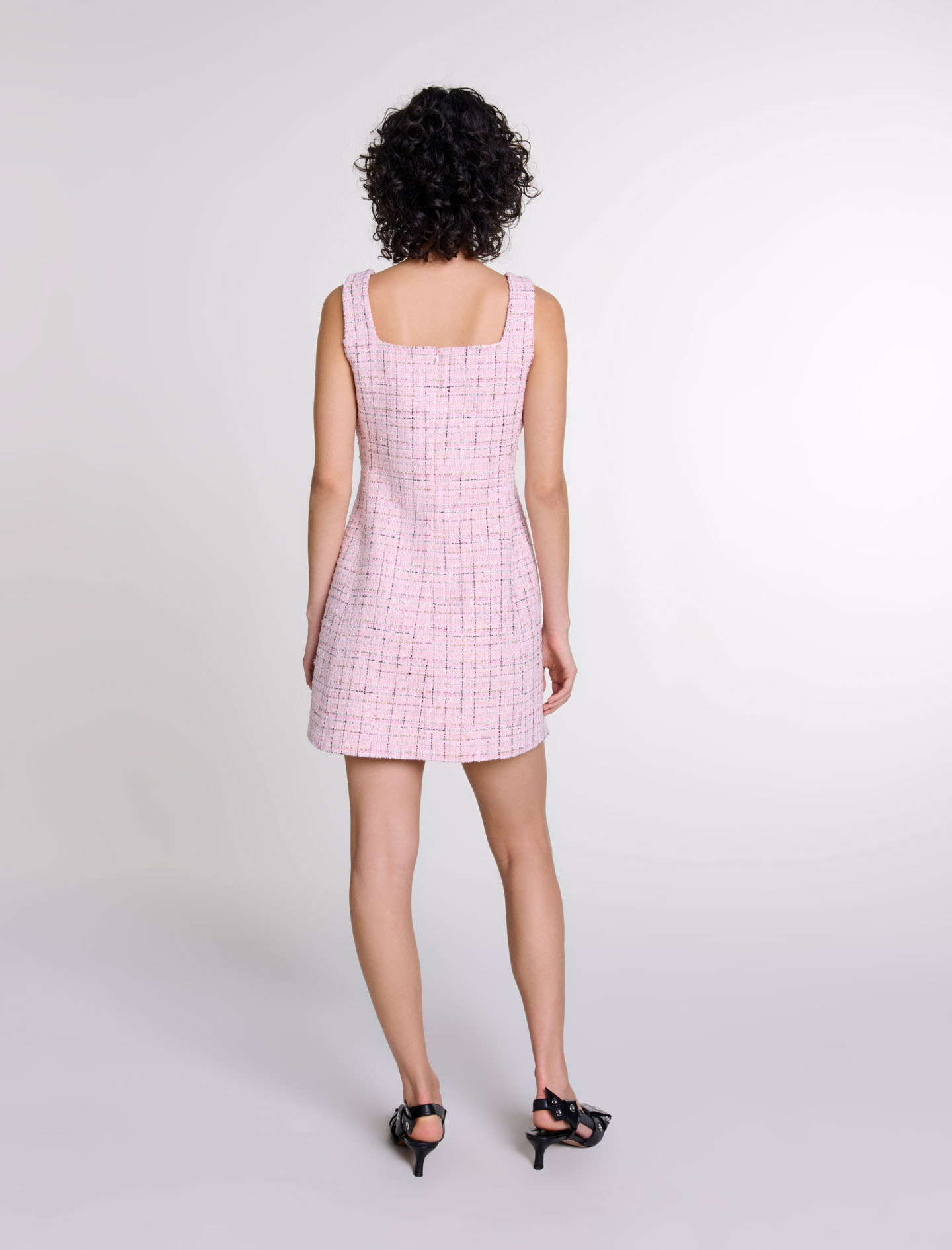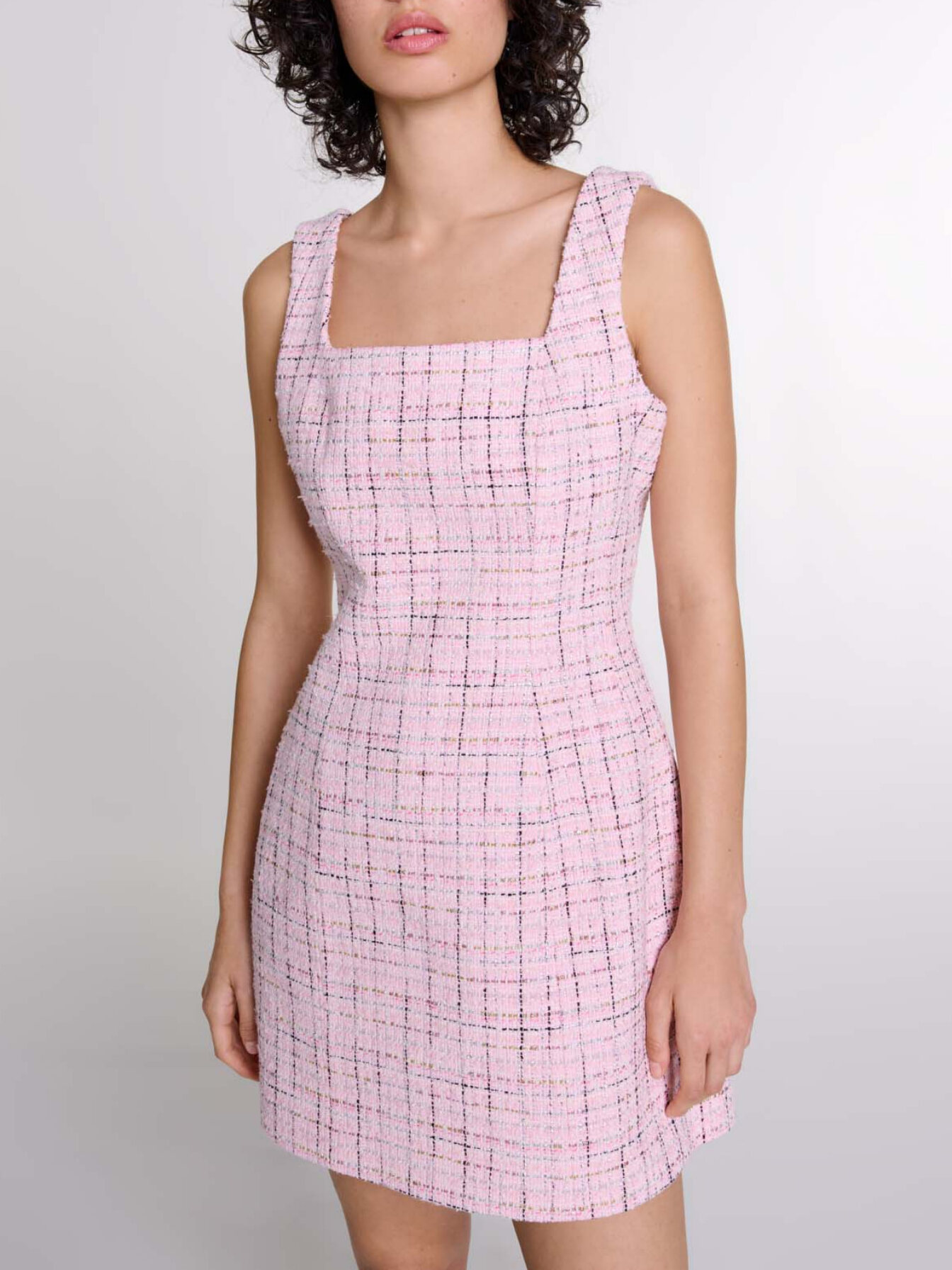 Short tweed-effect dress with metallic threads Square neckline Wide straps Zip fastening at back.