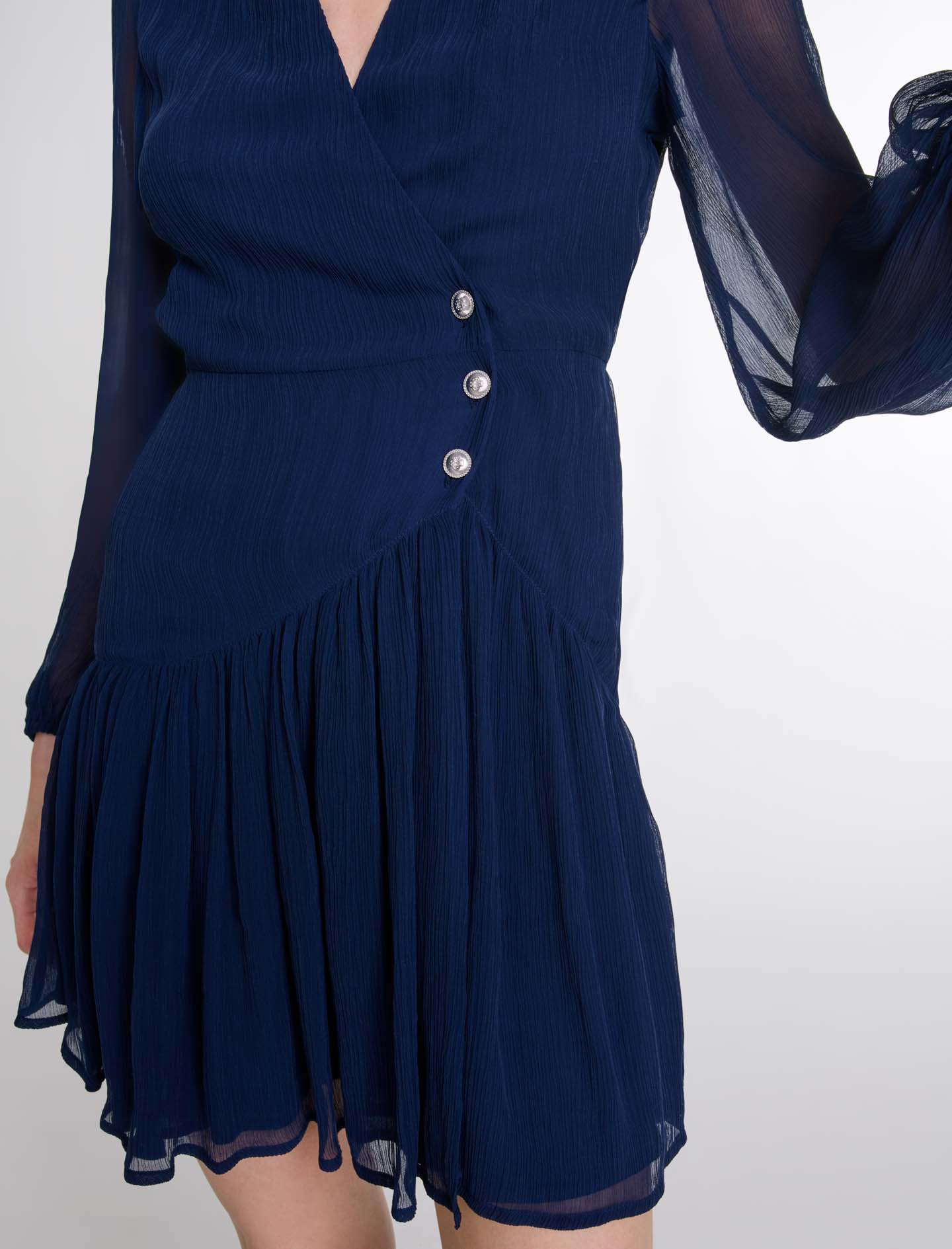 Chiffon-effect wrap dress Lined V-neckline Long semi-sheer sleeves Elasticated cuffs Press-stud fastening at the side Pleated ruffled skirt.
