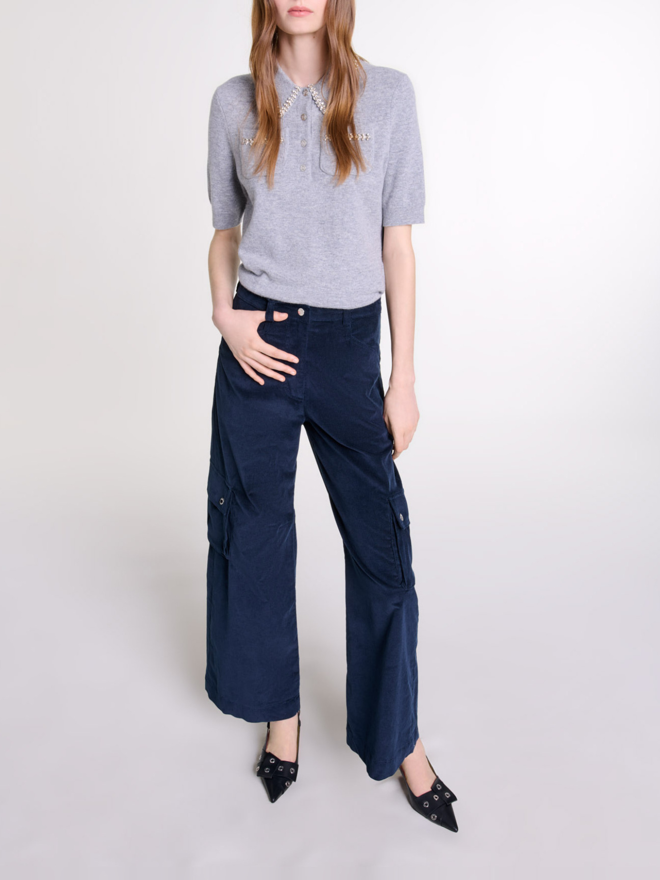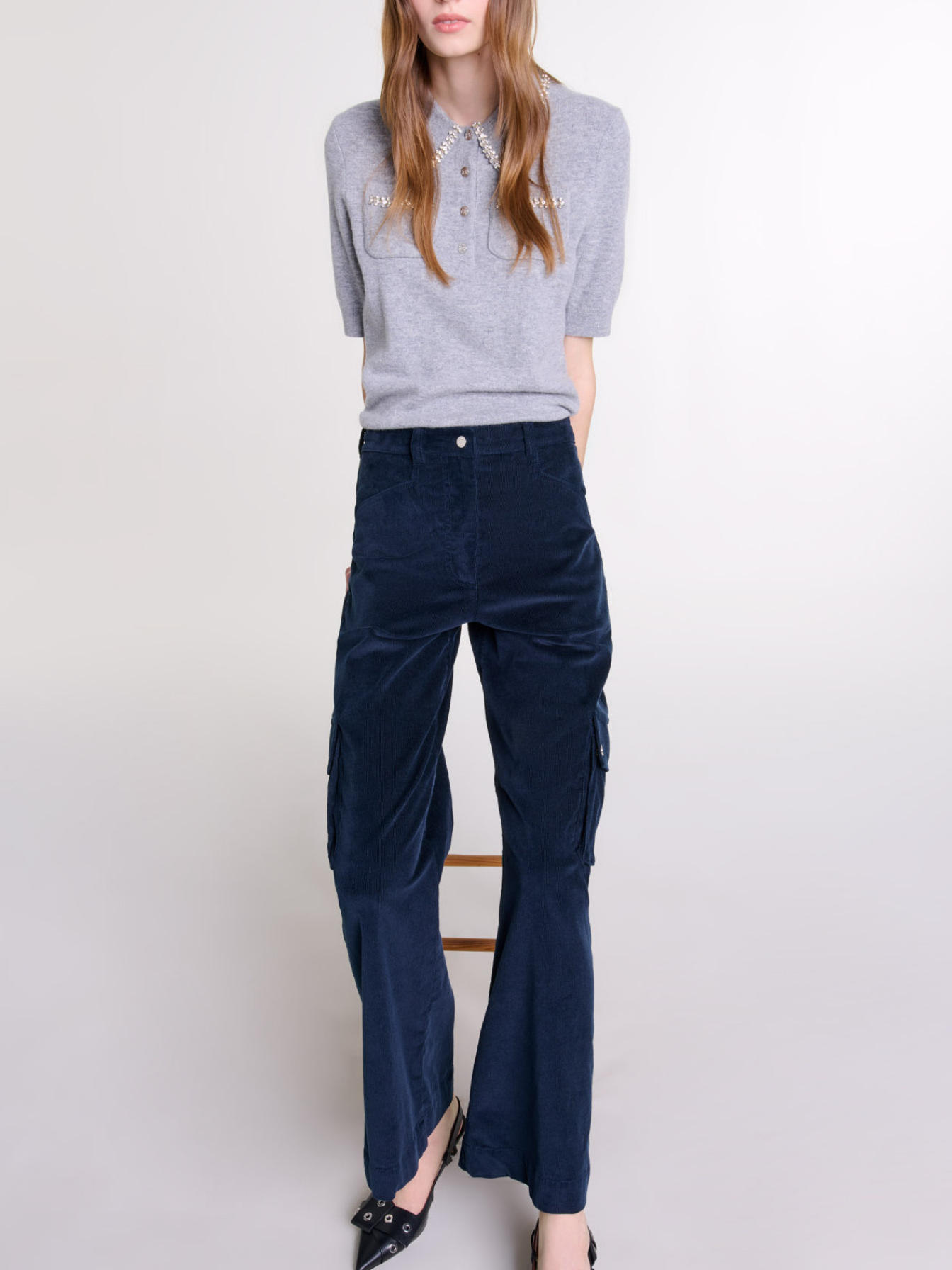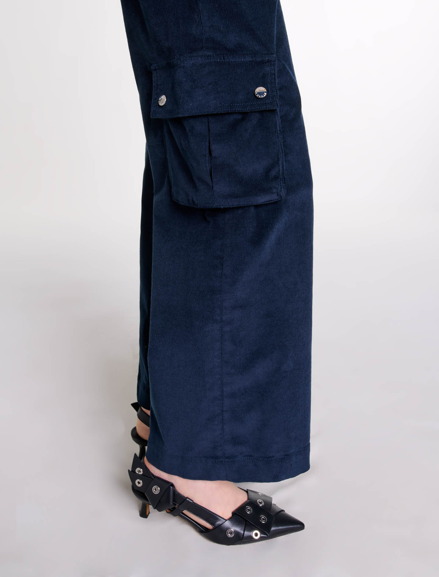 Corduroy trousers Wide-leg cargo fit Cargo pockets with press studs 2 front pockets 2 back pockets Zip and button fastening.