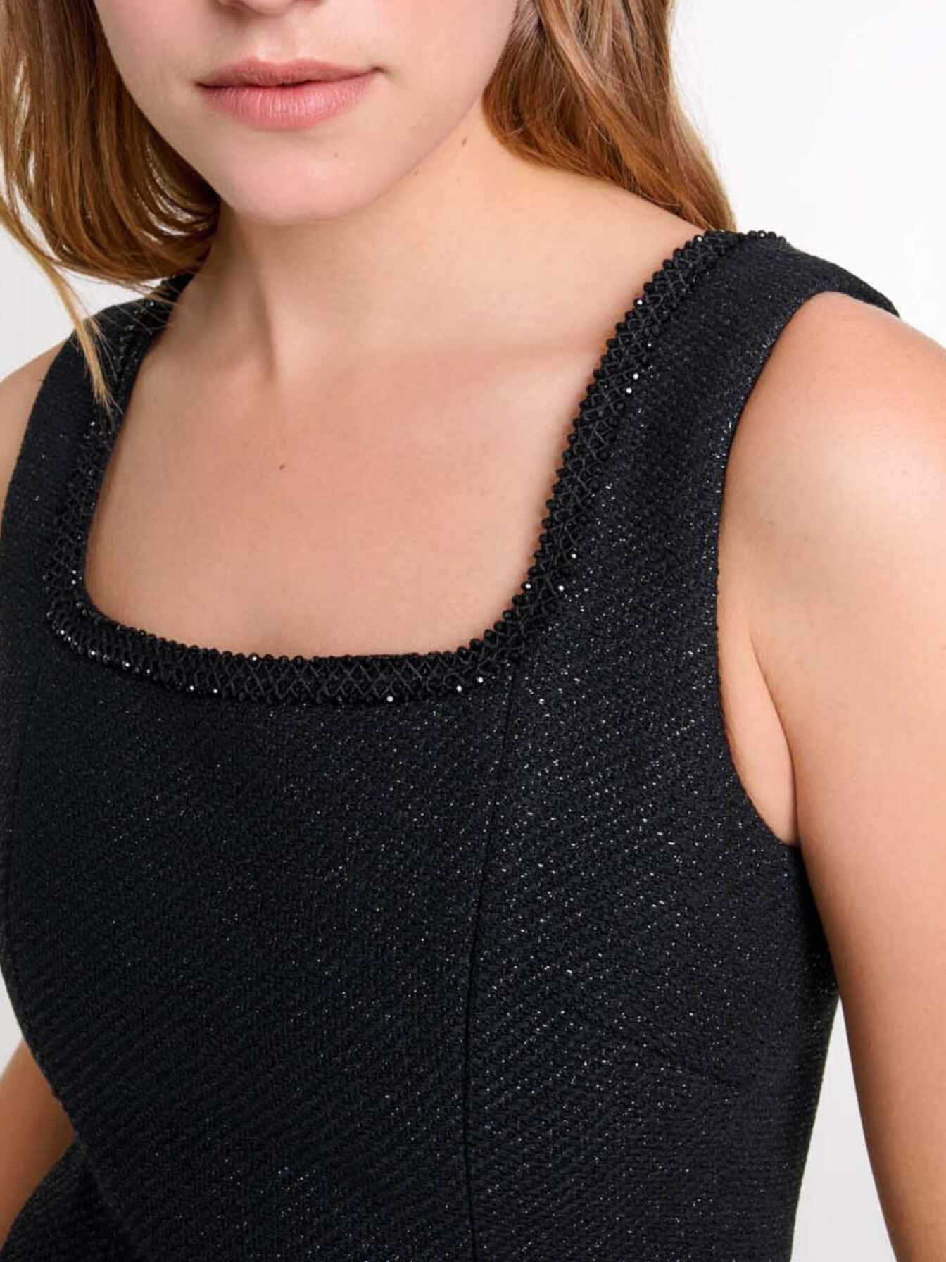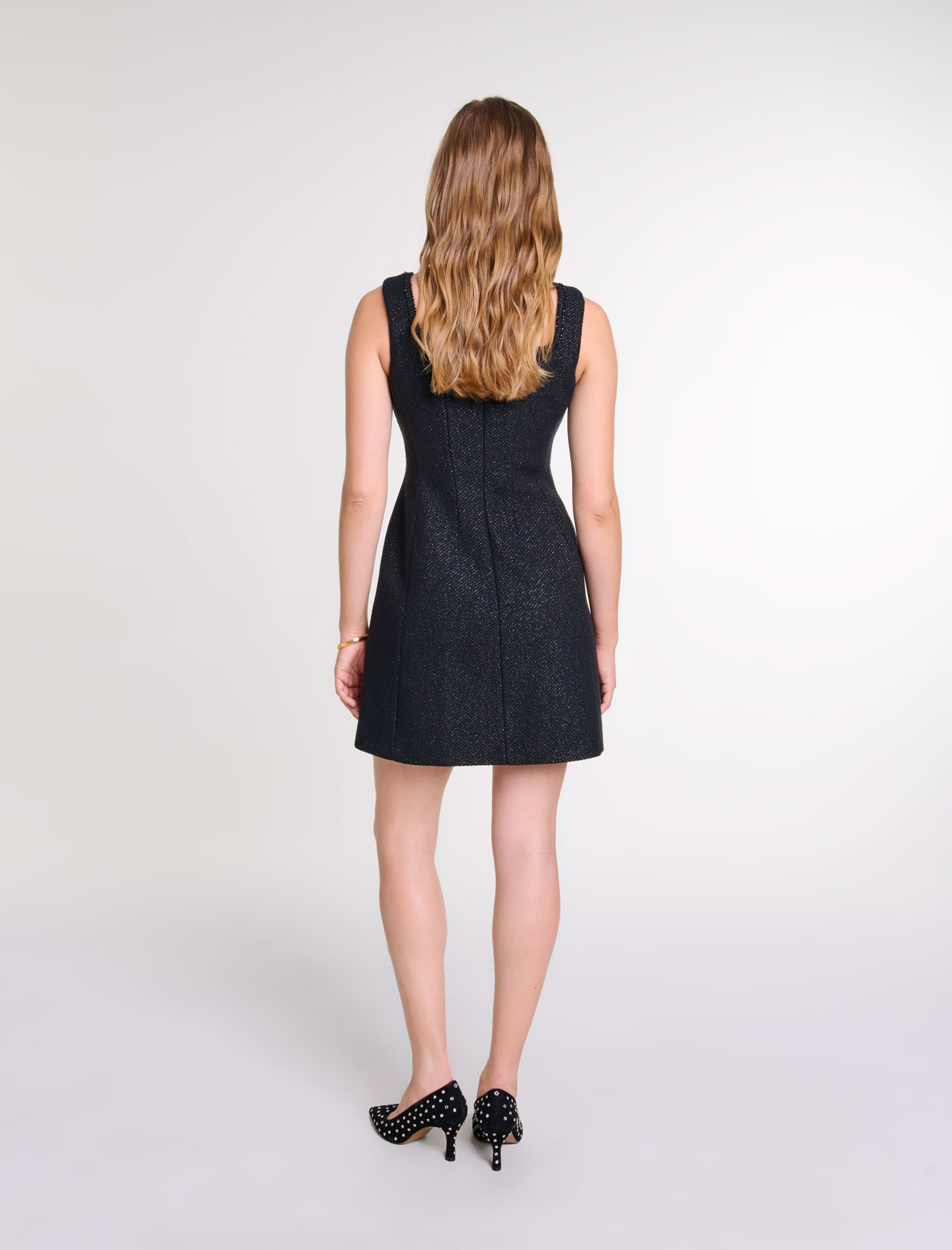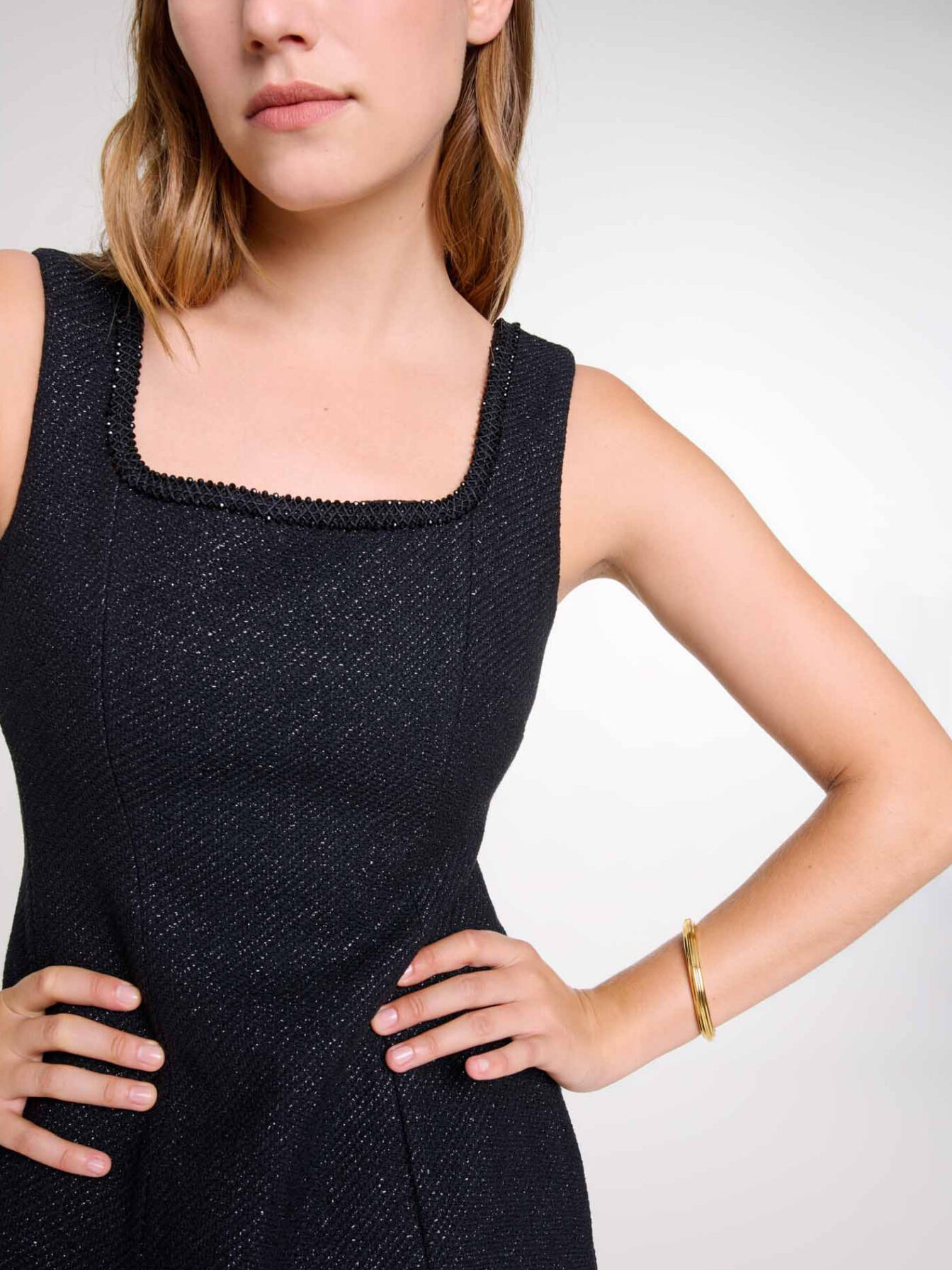 Short-sleeved tweed dress Square neckline with rhinestones Wide straps 2 pockets Slightly flared waist Zip fastening at back Runs big, size down.