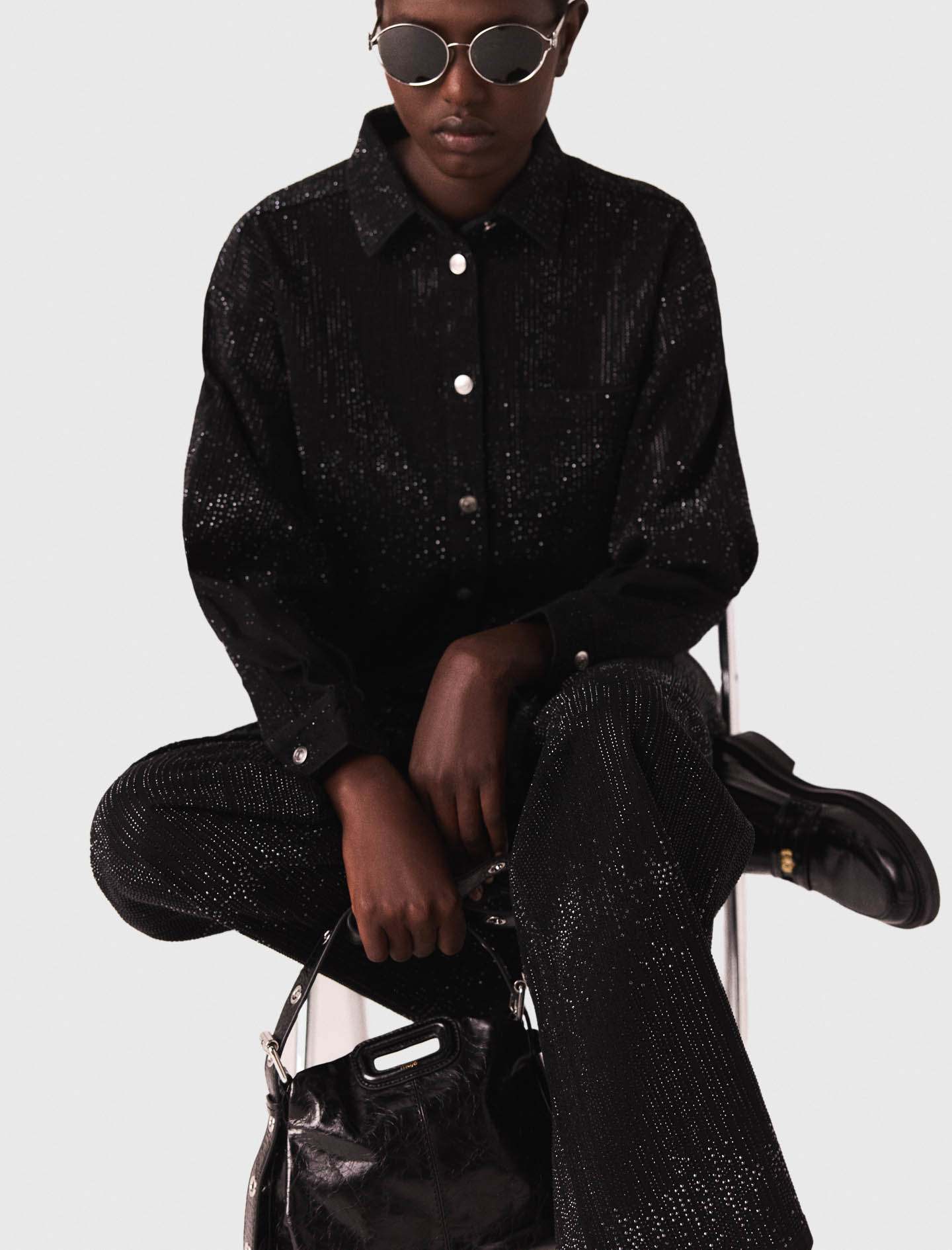 Covered entirely in tone-on-tone rhinestones, this denim shirt will make your winter sparkle.