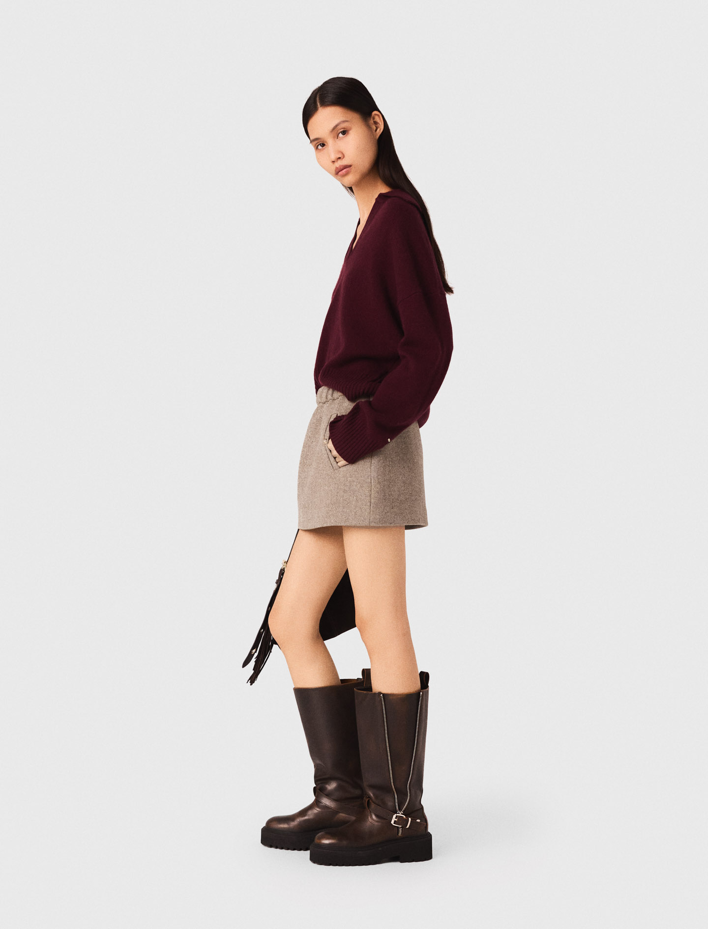 Maje wool Mini skirt in wool blend Elasticated waist and flap pockets Side zip fastening Designed for a standard fit A stylish silhouette designed for everyday wear.