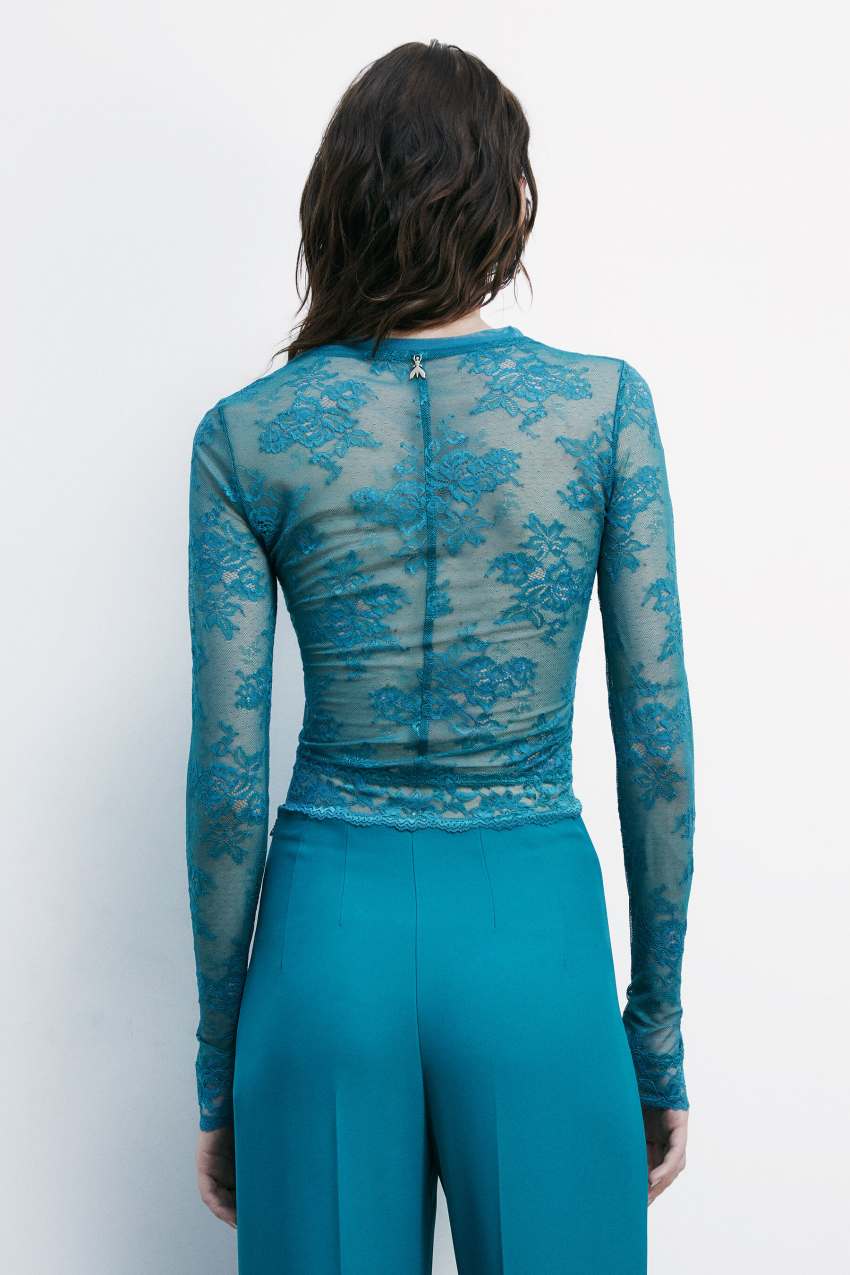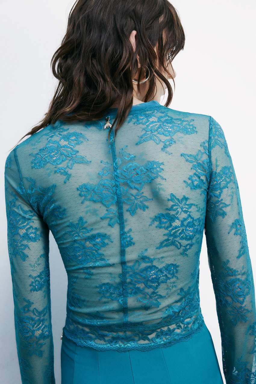 La maglietta a maniche lunghe in pizzo stretch avvolge il corpo come una seconda pelle.